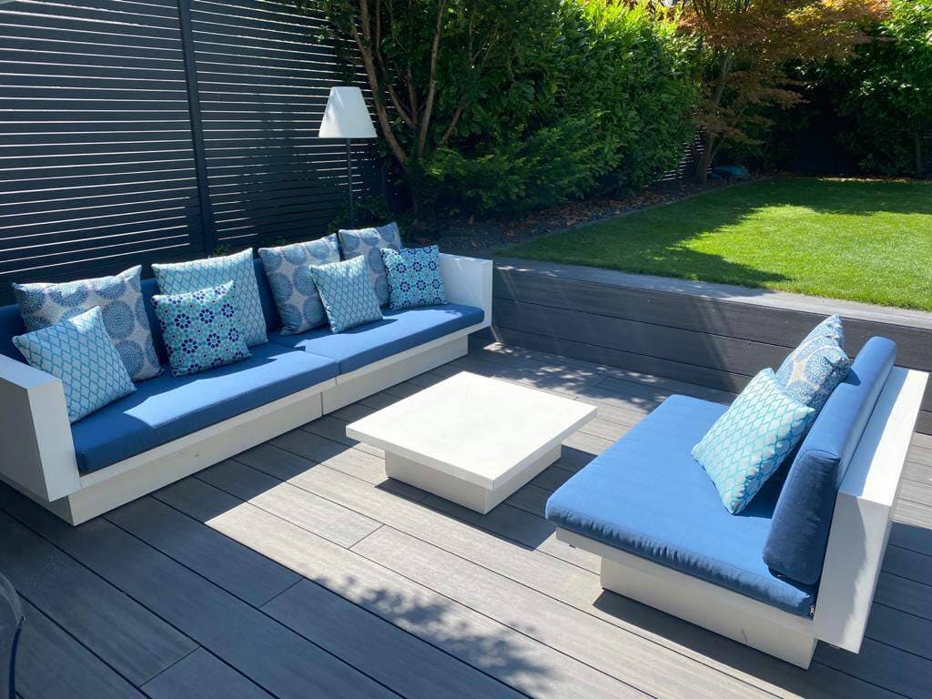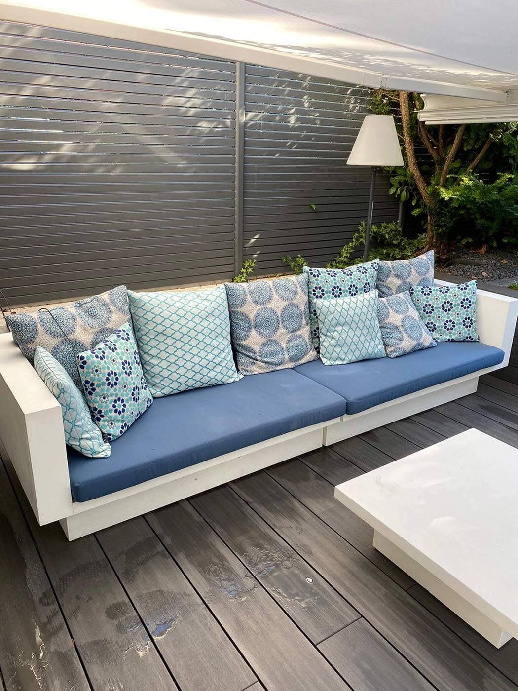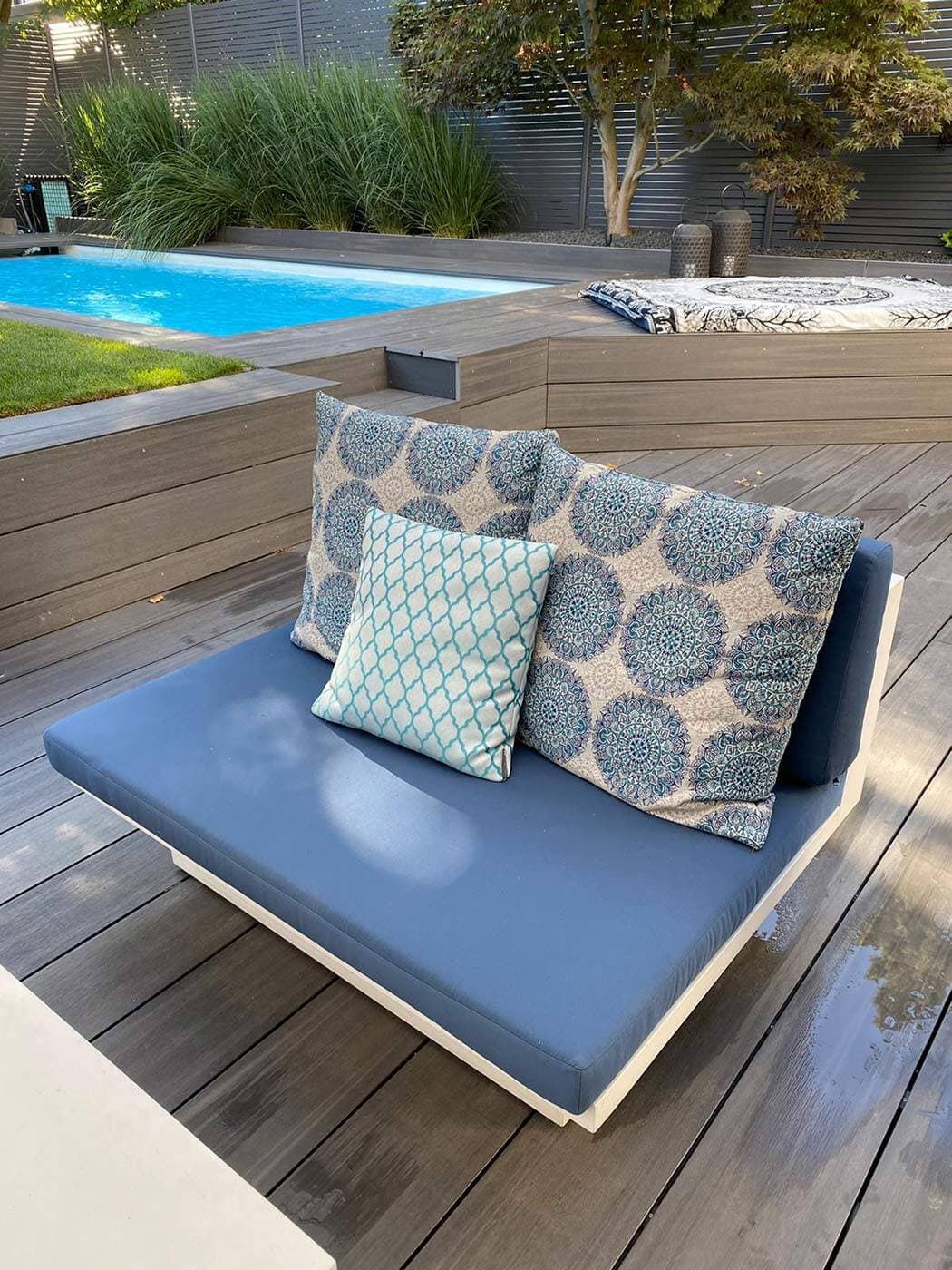 DER POOLBEREICH IM PRIVATEN GARTEN WURDE IM ZUGE DER NEUGESTALTUNG UMFASSEND OPTIMIERT UND AUFGEWERTET. IM SINNE EINES MODERNEN GARTENDESIGNS UND IM EINKLANG MIT DER ÜBERGREIFENDEN INNENARCHITEKTUR WURDEN DIE VORHANDENEN GARTENMÖBEL DES BAUHERRN INTEGRIERT. ALLERDINGS MANGELTE ES AN KOMFORT UND BEQUEMLICHKEIT FÜR EINEN OPTIMALEN ENTSPANNUNGSBEREICH. UM DAS OUTDOOR LIVING ZU VERBESSERN, HABEN WIR EXKLUSIVE LOUNGE-SOFAS MIT MASSGESCHNEIDERTEN POLSTERAUFLAGEN VON SOPHISTICATED LIVING GEFERTIGT. DIESE OUTDOOR MÖBEL STEHEN FÜR MAXIMALEN KOMFORT UND STIL IM AUSSENBEREICH. DIE KISSENBEZÜGE, AUS ROBUSTEN UND WETTERBESTÄNDIGEN MATERIALIEN, STAMMEN AUS DER EXKLUSIVEN KOLLEKTION „AROUND THE WORLD“ VON JABANSTOETZ, DIE FÜR HOCHWERTIGES DESIGN UND LANGLEBIGKEIT IM BEREICH AUSSENMÖBEL BEKANNT IST. DURCH DIESE DESIGN- UND MÖBLIERUNGSLÖSUNGEN WIRD DER GARTEN ZU EINER WAHREN WOHLFÜHLOASE, DIE LUXUS UND FUNKTIONALITÄT VERBINDET.